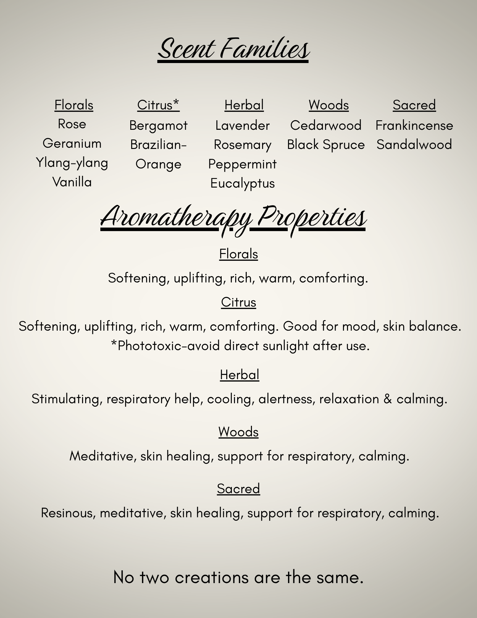 Choose your favorite scents from our wide array of oils, Our Signature Scents, or let us create a unique formula just for you!